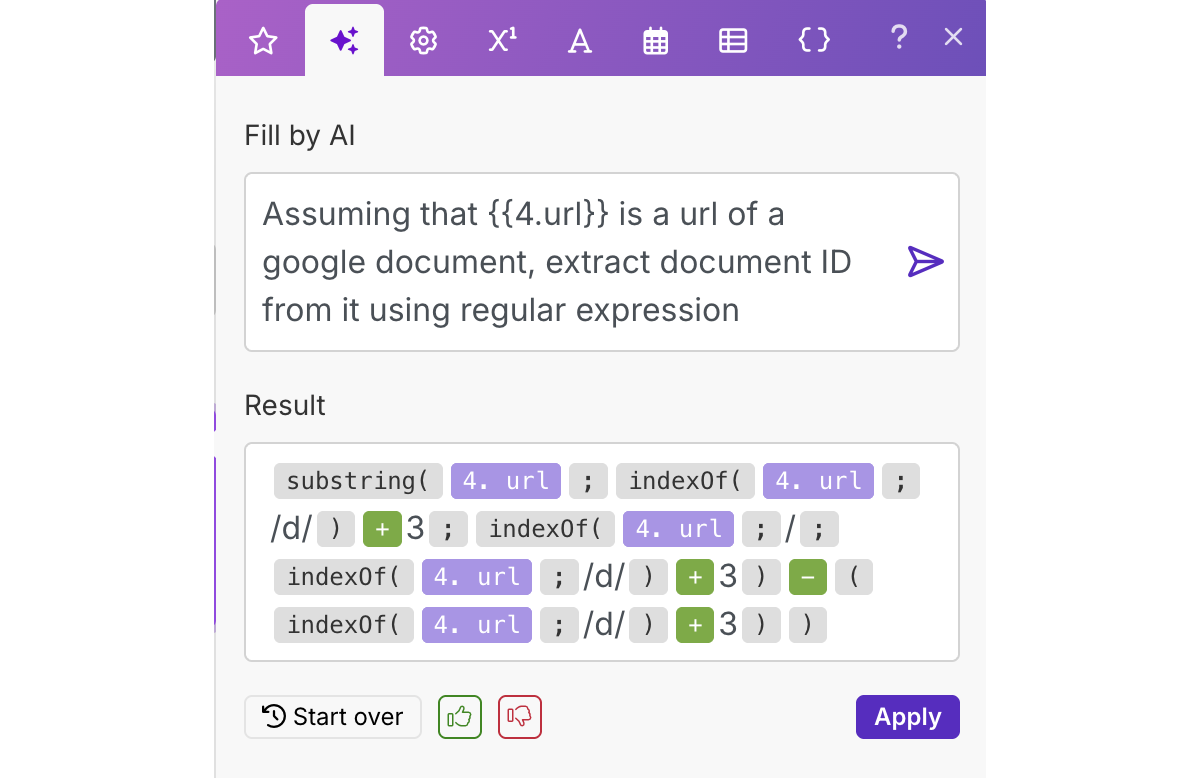 Блок Google Docs, конечно, есть в Make, и он не требует API-ключей или других сложностей, описанных в первой части для записи в Google Drive. Здесь есть лишь одна небольшая трудность: из гиперссылки на документ нужно получить Document ID (т.е. строку без слешей). Однако функцию для этого преобразования удобно сделать с помощью AI, встроенного в сам Make. Не всегда он работает хорошо, но в данном случае выдал корректный результат (пусть и громоздкий, без regex):