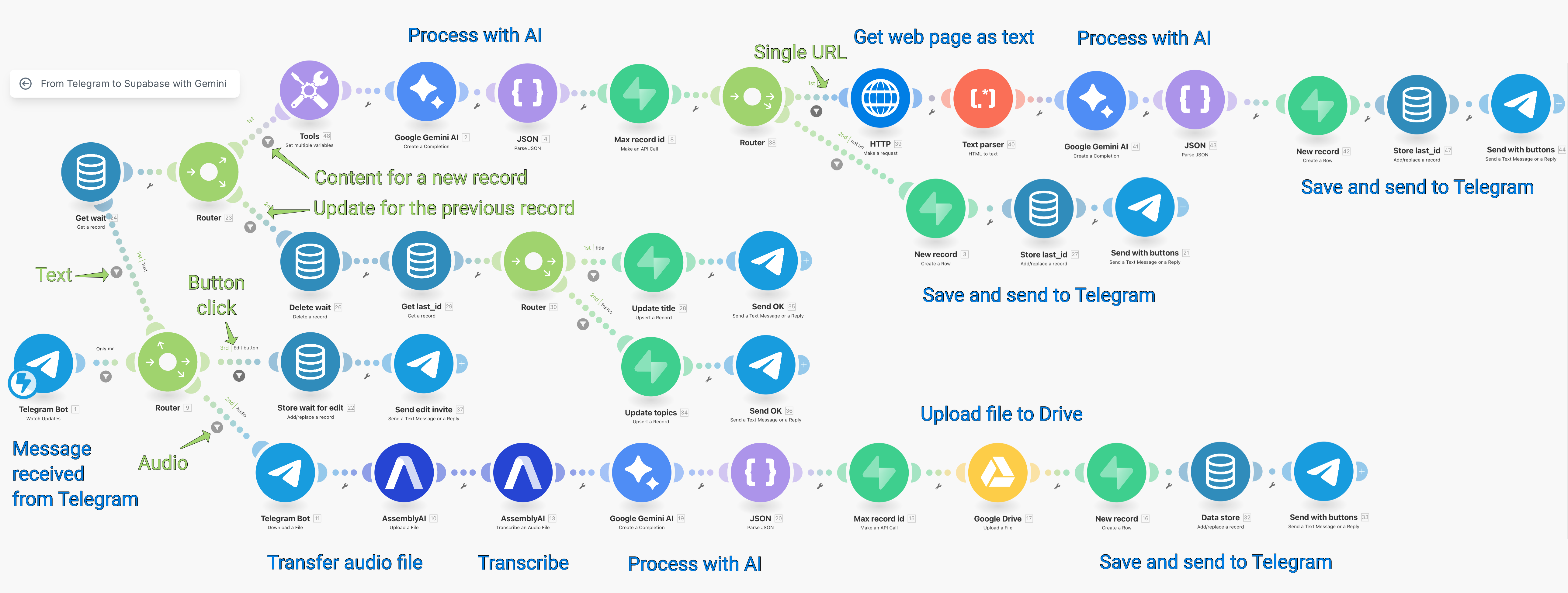 Если вы новичок в Make, то для начала выполните первые 2 пункта инструкции из первой части — сохранение сообщения из Telegram в Google-таблице (если вы знакомы с базами данных, вместо Google Sheet можете сразу взять Supabase).