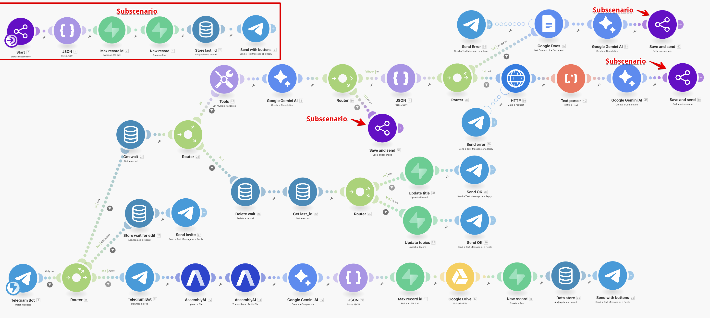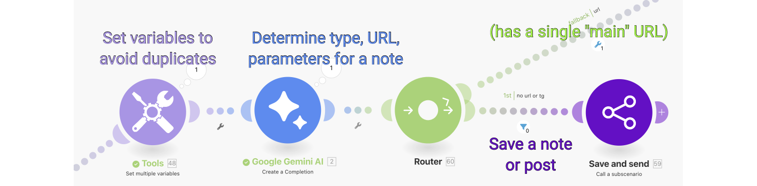 В трех блоках Gemini промпты немного отличаются, поэтому я не стал вносить этот блок внутрь подсценария. В частности, гугл-документы могут содержать информацию, связанные с моей работой или личными проектами, поэтому в промпт там добавлены соответствующие категории.