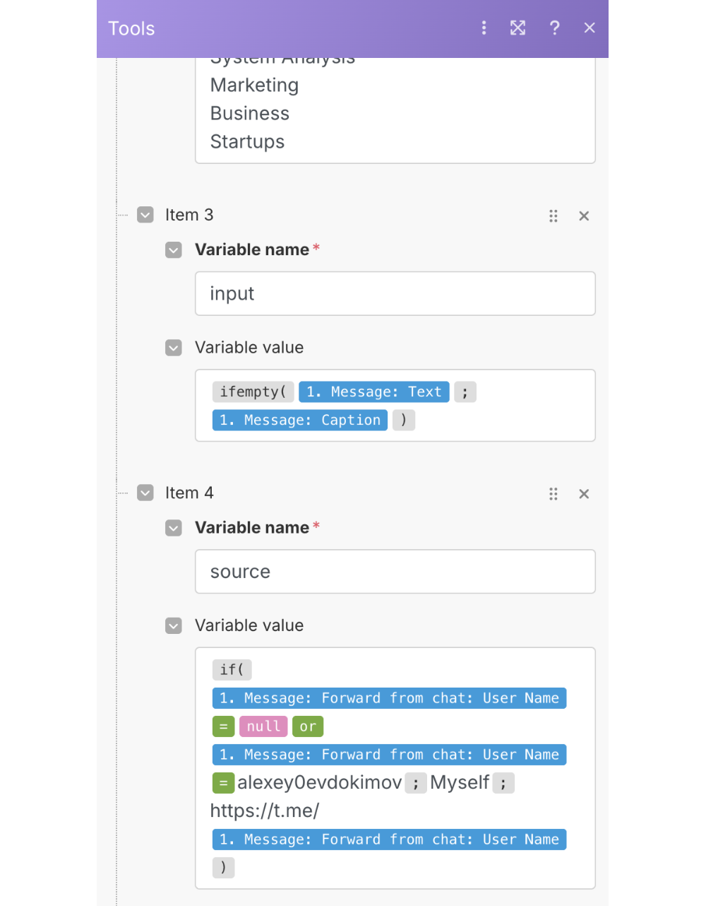 Переменная input нужна, поскольку многие посты в телеграме содержат картинки, и тогда их текст находится в Caption, а не в Text. А переменная source — чтобы отличать свои заметки от чужих постов как в промпте, так и в самой базе знаний.