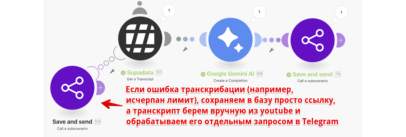 Чтобы избегать дублей, в n8n есть sub-workflows, в Zapier — sub-zaps, в Make.com — subscenarios: